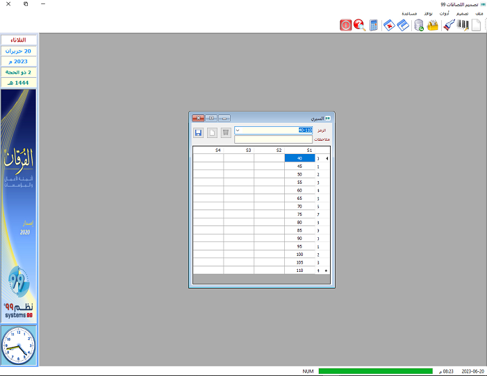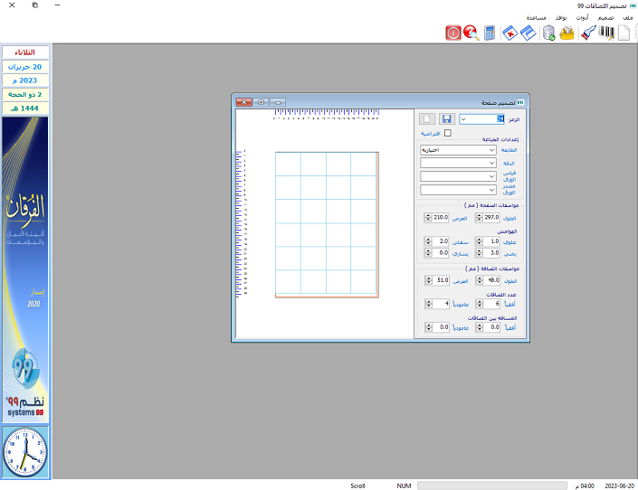 - نافذة تصميم تمكنك من التحكم بمواصفات الصفحة من طول و عرض و عدد اللصاقات في الصفحة و أبعاد اللصاقة